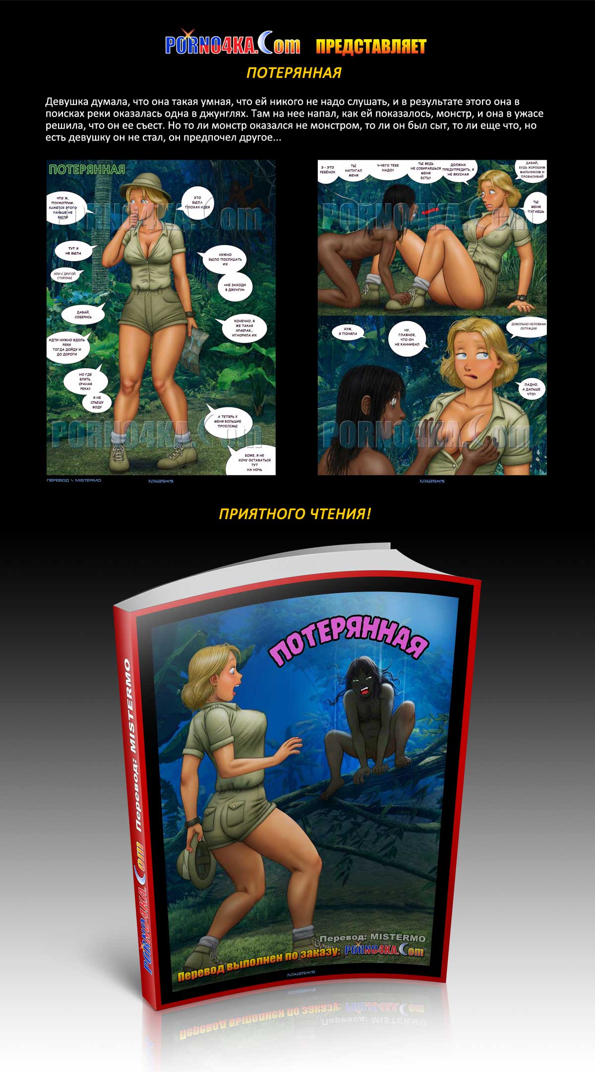 Девушка думала, что она такая умная, что ей никого не надо слушать, и в результате этого она в поисках реки оказалась одна в джунглях. Там на нее напал, как ей показалось, монстр, и она в ужасе решила, что он ее съест. Но то ли монстр оказался не монстром, то ли он был сыт, то ли еще что, но есть девушку он не стал, он предпочел другое…