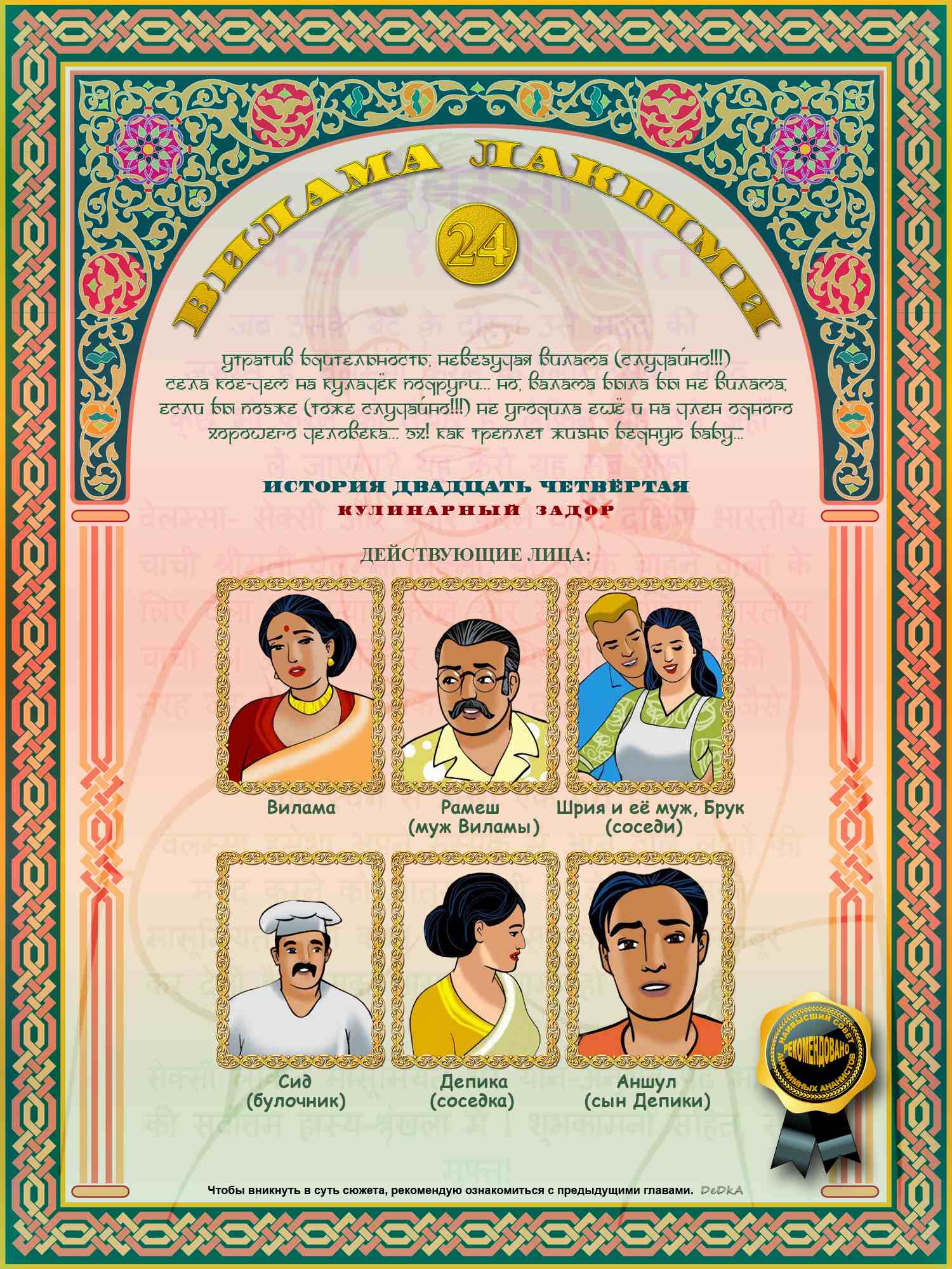 Вилама и её подруга, а с недавних пор и любовница, Шрия, напряжённо трудились на кухне. Но, едва их мужья свалили в пивбар, Шрия предложила Виламе немножко отдохнуть. Их краткий отдых закончился обоюдным оргазмом. Вечером обе дамы помогали соседке Депике проводить день рождения её дочери. Там Вилама познакомилась с сыном Депики, Аншулом, который удостоится ласк Виламы, но только в 26-м выпуске комикса. Не пропустите! 🙂 А вот знакомство с булочником Сидом, уже в этом комиксе приведёт Виламу в конце дня в его пекарню, где Сид предложит ей покулинарить вместе с ним. В пекарне будет очень жарко и в прямом, и в переносном смысле. Их работа закончится тем же, чем и отдых со Шрией в начале комикса. Одним словом, круг замкнулся! У Виламы снова был удачный день!